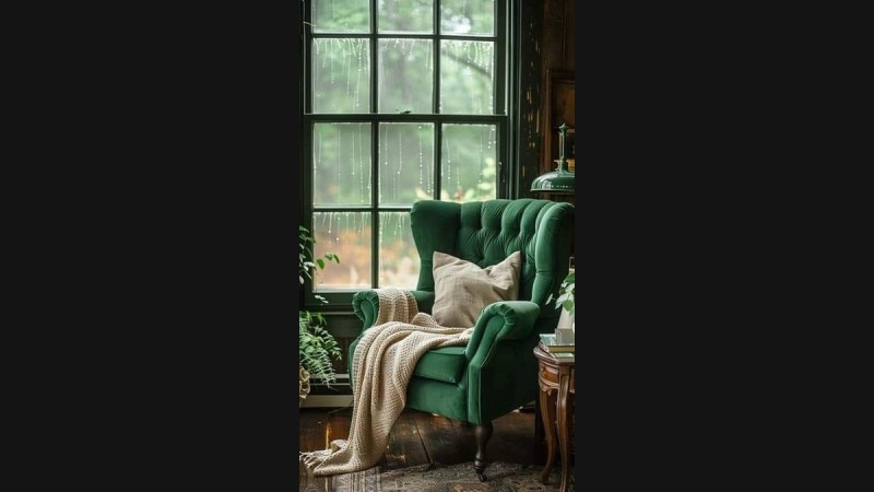 Egy zöld fotel áll az ablak mellett.