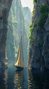 A képen egy vitorlás halad át sziklák között.